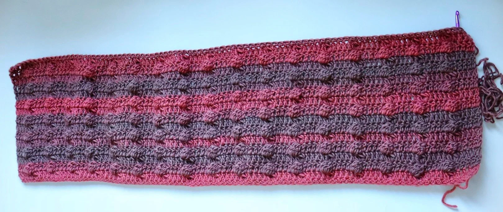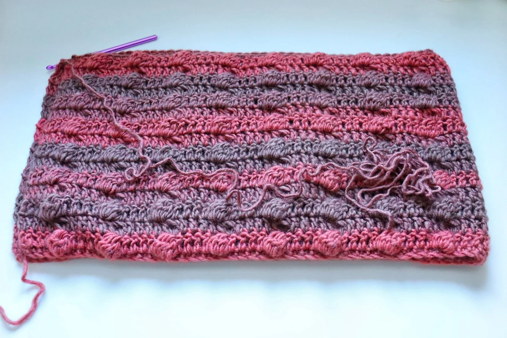 Row 2 – ch 2 (count as 1 dc), dc in the next 3 sts, *bubble st in the 4th st, dc in the next 4 sts, rep from * until 5 sts left, dc in the last 5 sts, turn.